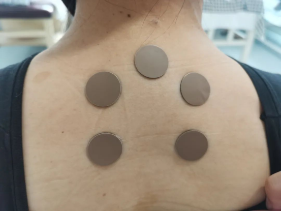 6、以貼灸處皮膚潮紅或自覺背部瘙癢、灼熱、刺痛,大約4-6h后隨即移去磁貼,兒童可2-4h移去。